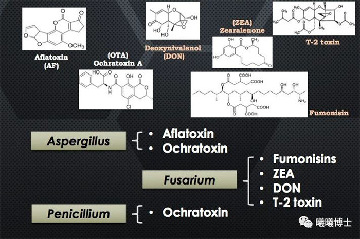 目前已知的霉菌毒素超過了300種。其中最常見的、與畜牧業(yè)最息息相關(guān)的,是這三種霉菌產(chǎn)生的6種毒素: