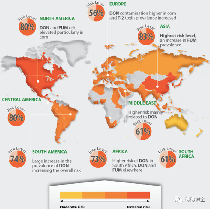 2017年全球霉菌毒素污染的調(diào)查結(jié)果 --- 亞洲的污染最為嚴重, 83%的飼料和原料樣品中至少含有1種霉菌毒素 (圖片來自biomin)
