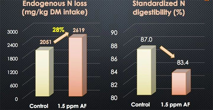 1.5ppm黃曲霉毒素對21日齡肉雞的內(nèi)源氮流失 & 回腸標準氮消化率的影響 (引自Chen et al., 2016)